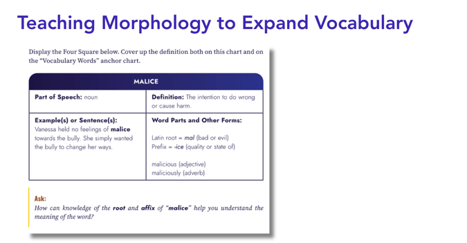 A root like mal, for example, carries over into words such as malicious, malfunction, and malnutrition, giving students a foothold in each new context.